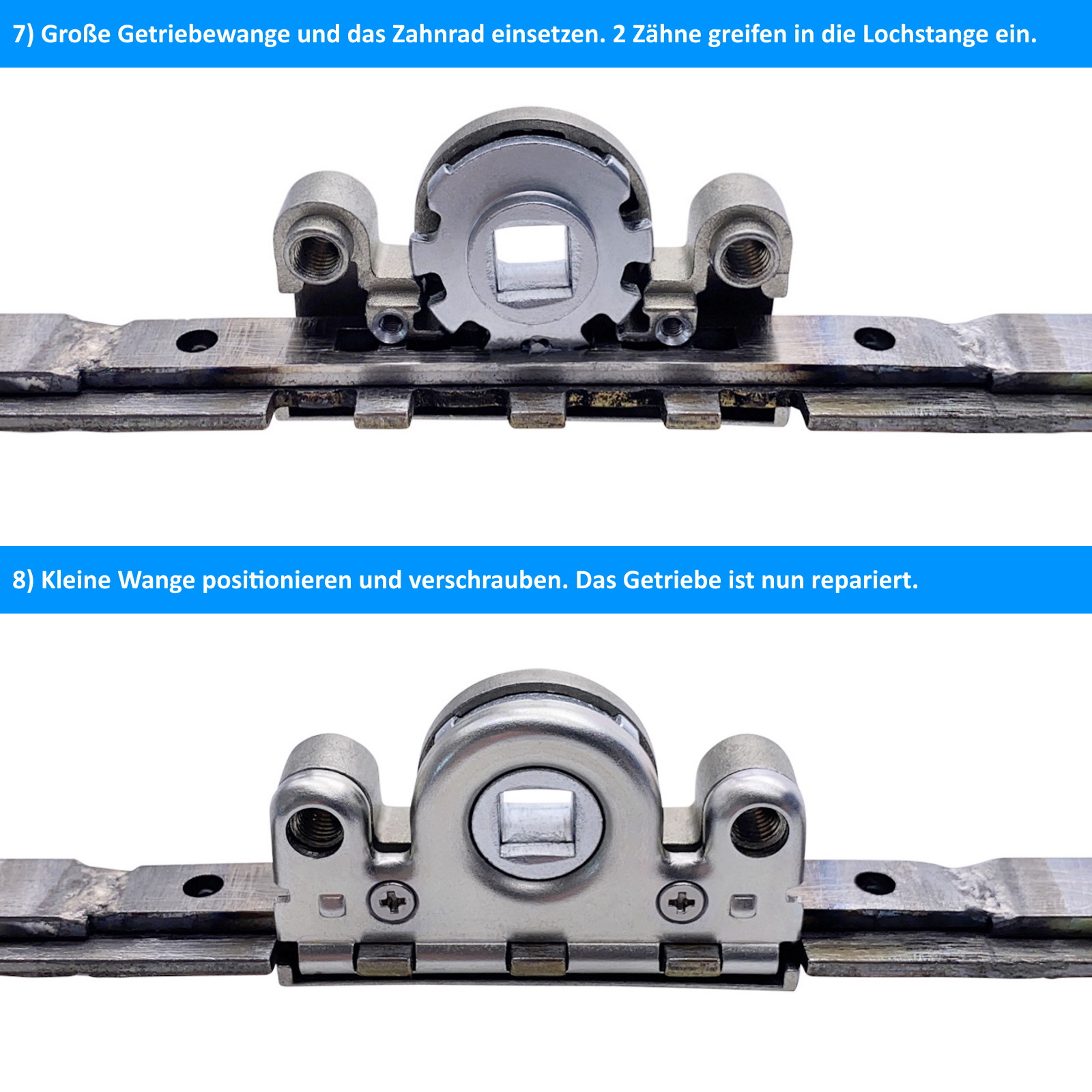 6) Beide mitgelieferten Schrauben in die beiden vorhandenen Gewinde / Aussparungen verschrauben. Die Getriebeschiene ist nun repariert.