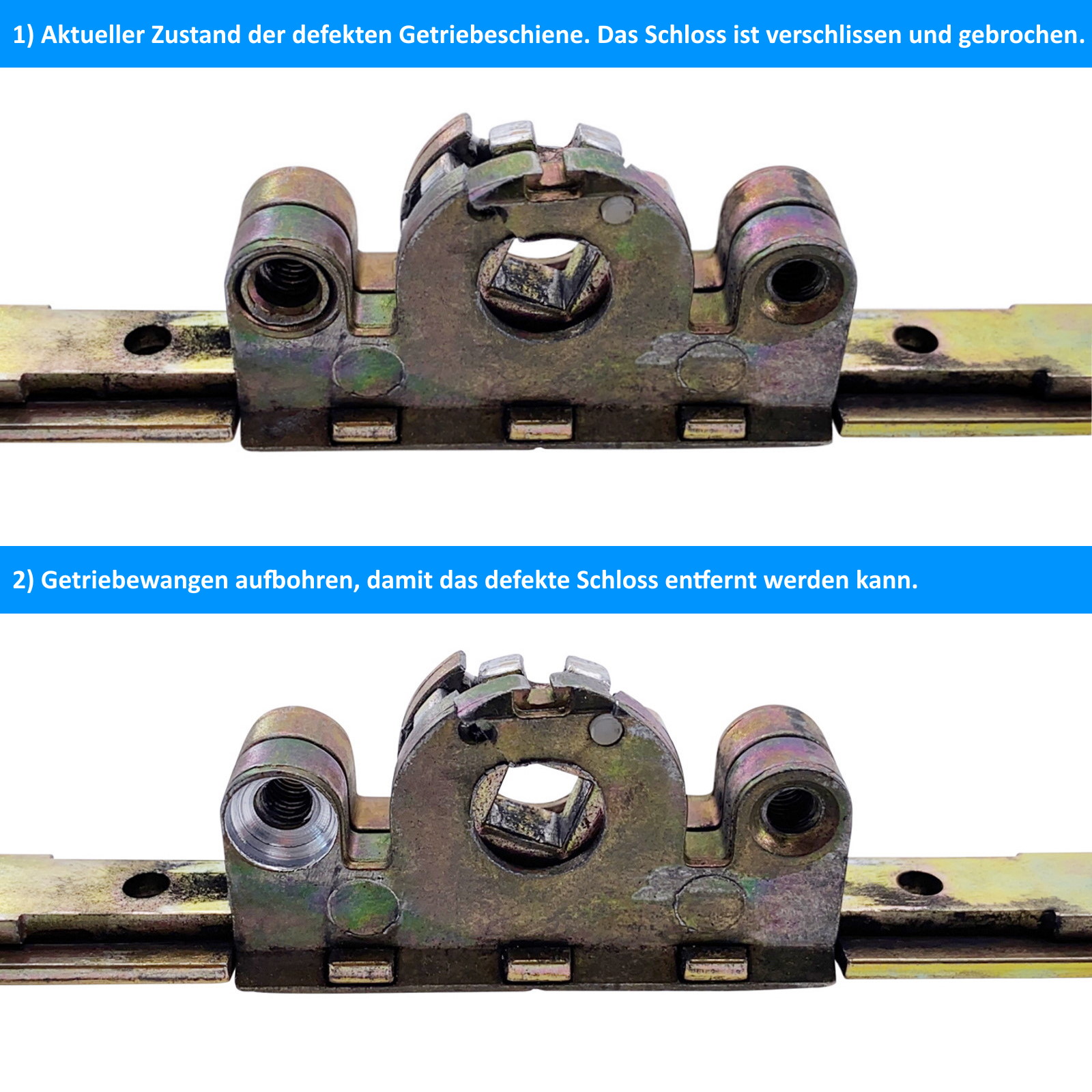 1) Defektes Getriebeschloss Ihrer Getriebeschiene demontieren/entfernen. Hierzu müssen Sie die Vernietungen aufbohren. Je nach Alter der Getriebeschiene sitzen die Vernietungen entweder auf beiden Seiten (wie im Bild zu sehen) oder bei neueren Modellen auf nur einer Wangen-Seite im unteren Bereich.