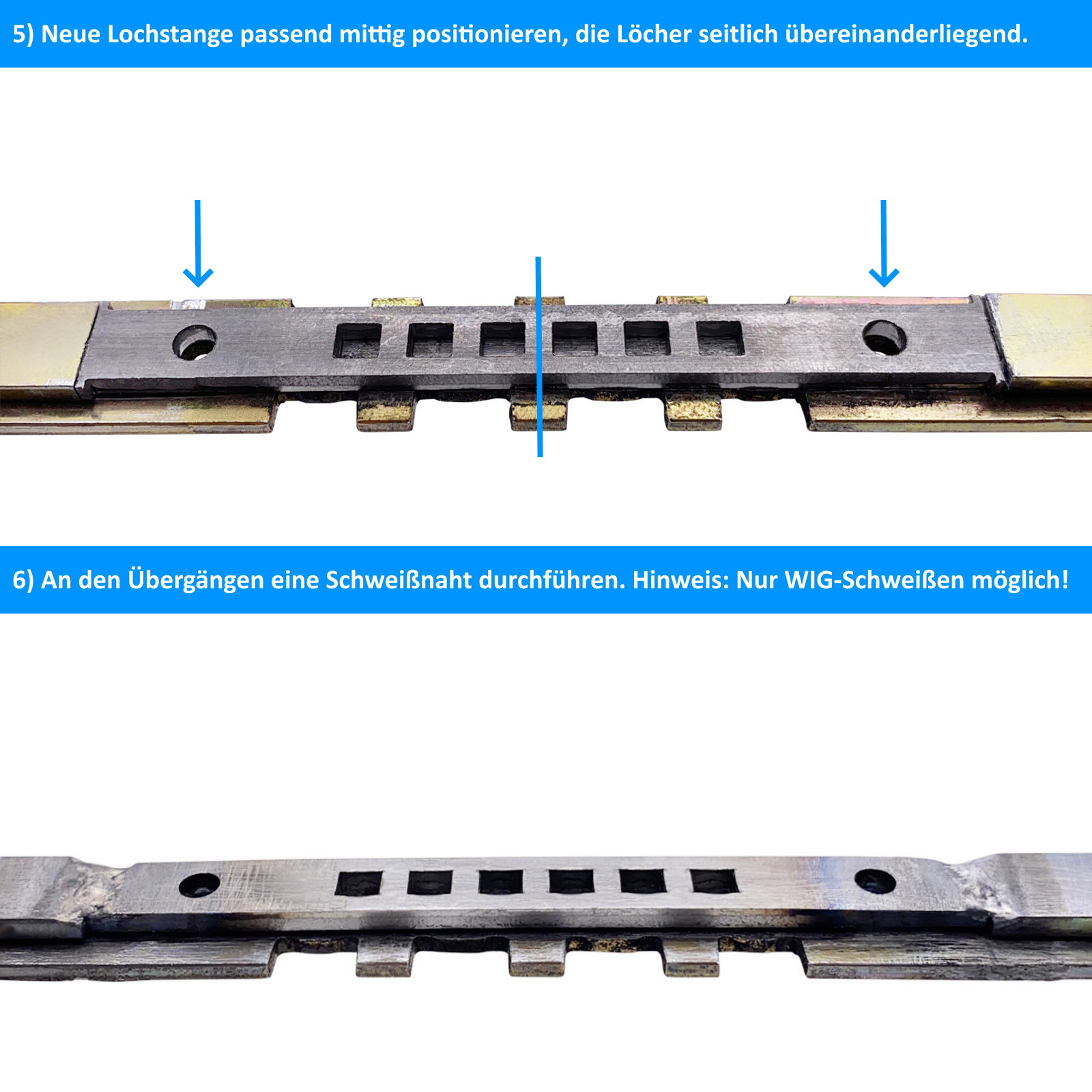 Zusätzlich im Set enthalten ist eine Lochstange, welche bei extremer Abnutzung neu eingeschweißt werden kann. Dadurch wird der Verschleiß komplett entfernt und erspart teure Instandsetzungskosten bei alten Getriebeschienen.